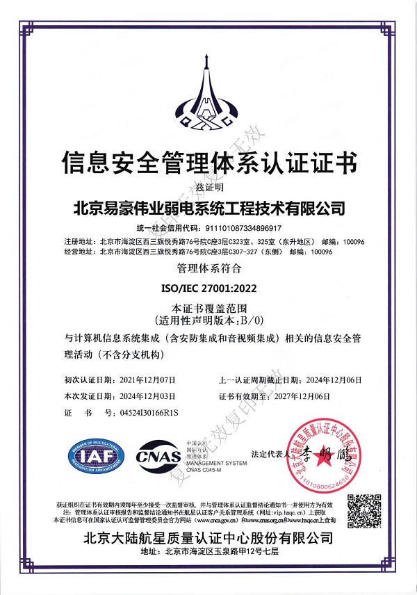 信息安全管理體系認(rèn)證證書(shū)