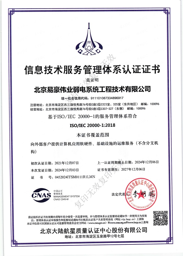 信息技術(shù)服務(wù)管理體系認(rèn)證證書(shū)